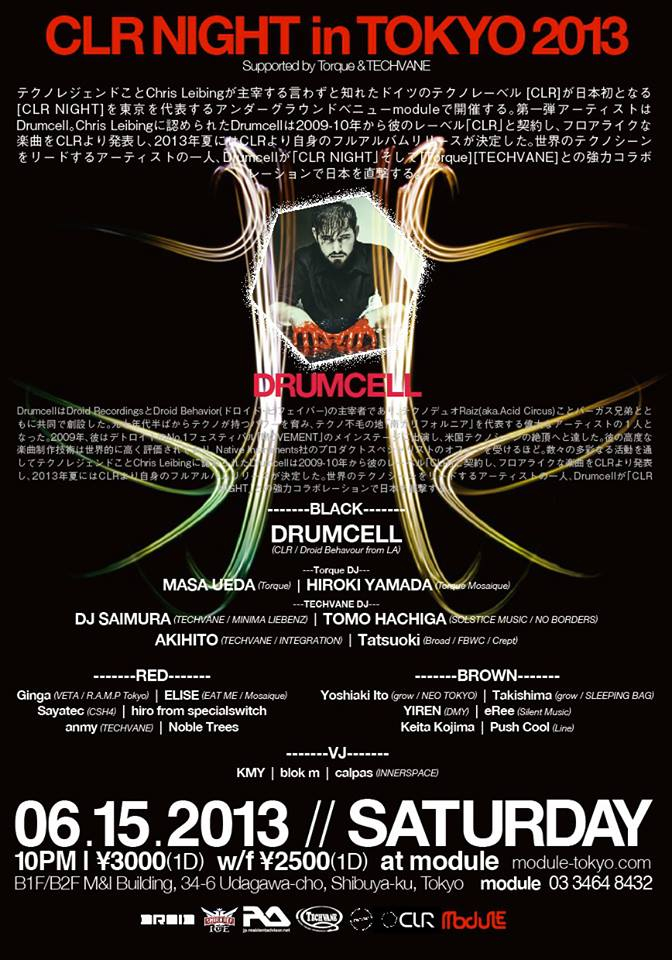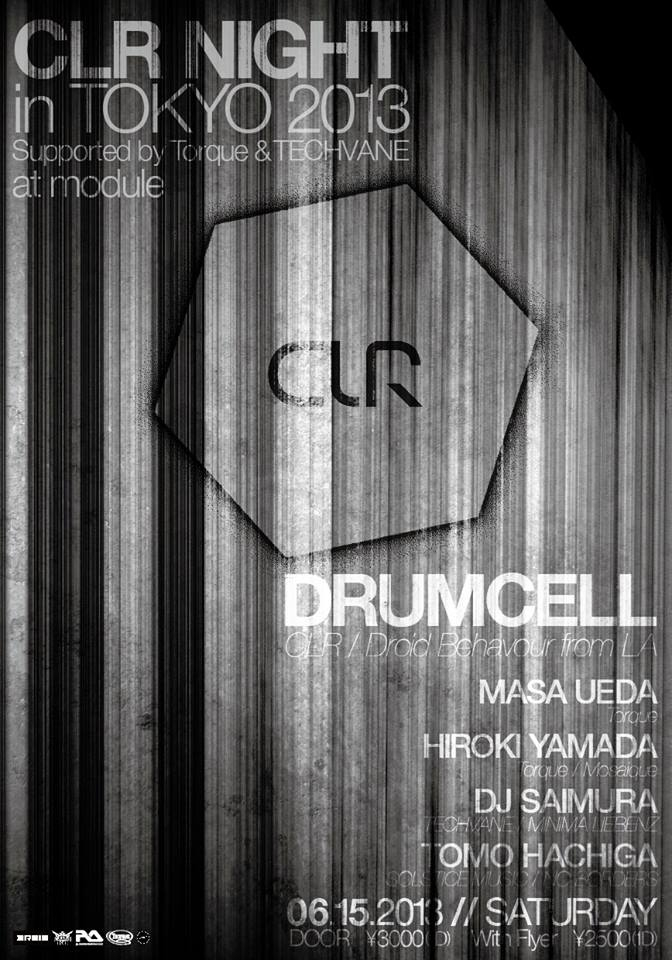 第一弾アーティストはDrumcell。Chris Leibingに認められたDrumcellは2009-10年から彼のレーベル「CLR」と契約し、フロアライクな楽曲をCLRより発表し、2013年 夏にはCLRより自身のフルアルバムリリースが決定した。世界のテクノシーンをリードするアーティストの一人、Drumcellが「CLR TOKYO」そして[Torque][TECHVANE]との強力コラボレーションで日本を直撃する。